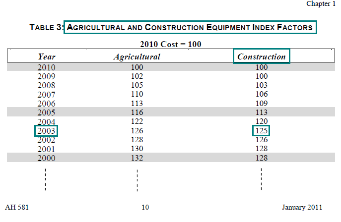 - Locate the index factor for construction equipment with a 2003 acquisition year, in Table 3 of the January 2011 AH 581. 2003 Year Acquired = 125